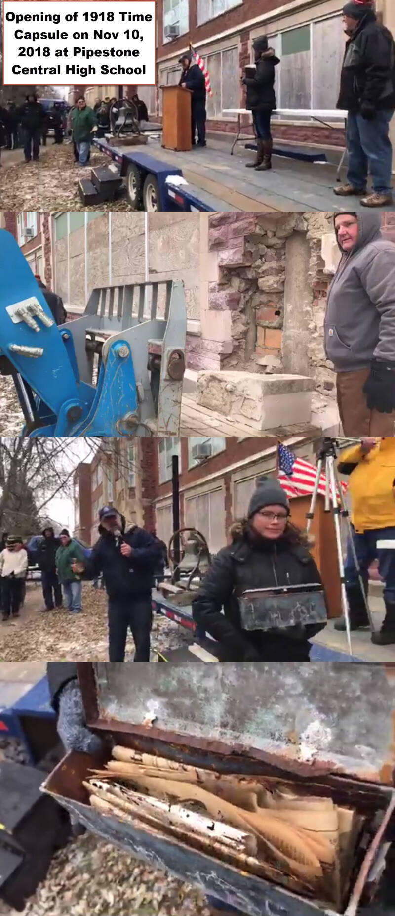On Saturday morning, November 10, 2018, the co-emcees of the Time Capsule opening ceremony were Pipestone County Board Chairman Dan Wildermuth, and Pipestone Mayor Myron Koets, with Susan Hoskins, Pipestone County Museum executive director, reading some history of both the Central School building and the time within which it was constructed during World War I